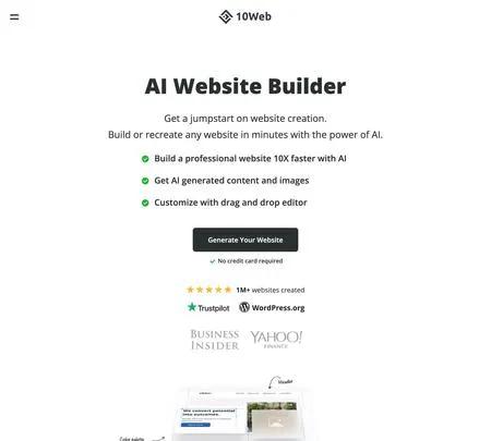10Web ist eine WordPress-Plattform, die Ihnen bei der Erstellung und Verwaltung Ihrer Website hilft. Das Besondere daran sind der AI Website Builder und der AI Writing Assistant. Ersterer generiert automatisch Websites gemäß den Bedürfnissen des Benutzers, während letzterer hochwertige Texte erstellt und SEO-Strategien unterstützt. Es berücksichtigt auch die Sicherheit, indem es Komponenten nur aus zuverlässigen Quellen aktualisiert. Darüber hinaus bietet es ein kostenloses Konto für einen KI-Assistenten, was es auch für Erstbenutzer zugänglich macht.