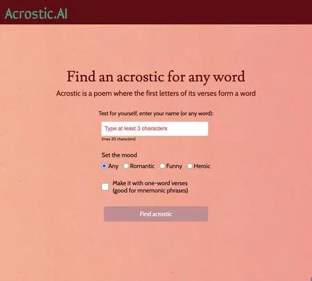 Acrostic AI ist ein einzigartiges Werkzeug, das die Freude an Poesie in Ihre Fingerspitzen bringt. Geben Sie einfach ein beliebiges Wort mit bis zu 20 Zeichen ein und sehen Sie zu, wie es ein personalisiertes Akrostichon-Gedicht erstellt, bei dem die Anfangsbuchstaben jeder Strophe Ihr gewähltes Wort bilden. Sie können sogar die Stimmung Ihres Gedichts festlegen und zwischen romantischen, lustigen oder heroischen Themen wählen. Für diejenigen, die eine Gedächtnisstütze suchen, kann Acrostic AI Akrosticha mit Ein-Wort-Strophen generieren. Geben Sie einfach Ihr Wort ein, klicken Sie auf "Akrostichon finden" und lassen Sie Acrostic AI Ihr Wort in ein Kunstwerk verwandeln.