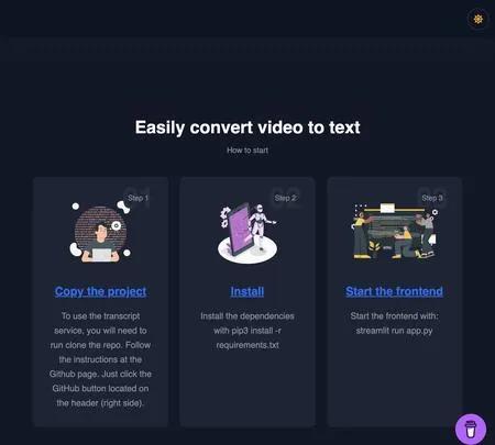 Video2text ist ein leistungsstarkes Tool, das mühelos Videoinhalte in Text umwandelt. Einfach das Repository von der Github-Seite klonen, die erforderlichen Abhängigkeiten installieren und schon kann es losgehen. Dieser Service ist perfekt für diejenigen, die Videoinhalte schnell und präzise transkribieren müssen. Egal, ob Sie Journalist, Student oder Forscher sind, Video2text kann Ihnen Zeit und Mühe sparen. Erleben Sie die Freude an effizienter Produktivität mit Video2text.