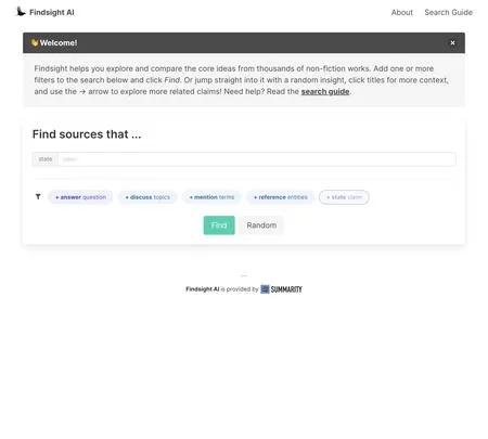 Findsight è un motore di ricerca unico progettato per esplorare contenuti non di finzione. Permette agli utenti di cercare in base alle 'affermazioni', offrendo una prospettiva nuova su come diverse fonti affrontano varie questioni. Con Findsight, puoi intraprendere il tuo percorso di apprendimento, scoprendo e confrontando punti di vista, e persino collegandoti alle fonti originali. Offre anche filtri di base e alimentati dall'IA per affinare la tua ricerca, rendendolo uno strumento potente per la ricerca e l'apprendimento. Che tu sia un nuovo utente o un ricercatore esperto, Findsight porta la gioia della scoperta e la soddisfazione di trovare informazioni accurate e rilevanti proprio a portata di mano.