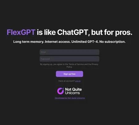 FlexGPT is an advanced version of ChatGPT, brought to you by Not Quite Unicorns. It's designed to offer unlimited access to GPT-4 without the need for a subscription. With its long-term memory and internet access, FlexGPT is a powerful tool that can enhance your AI experience. Whether you're seeking to solve complex problems or simply enjoy the convenience of AI, FlexGPT is your reliable partner. Experience the joy of seamless AI interaction with FlexGPT.