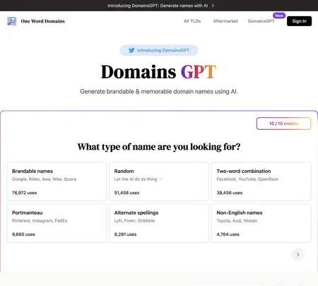 DomainsGPT is an innovative tool that leverages artificial intelligence to generate unique and catchy domain names. It's an ideal solution for those seeking relevant domain names for their websites or apps, outperforming similar tools like Namelix. Whether you're launching a new app, creating a mock startup, or securing a .ai domain, DomainsGPT makes the process effortless and engaging. Users often find the tool so captivating that they exhaust their free credits in one session, exploring various filters. Experience the joy of discovering the perfect domain name with DomainsGPT.