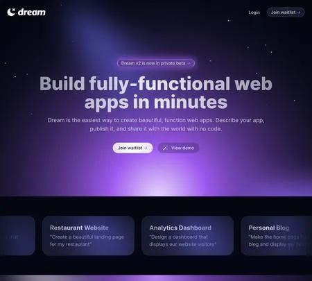 Dream is a revolutionary tool that empowers you to build web applications without writing a single line of code. Simply describe your app's functionality, layout, and design, and Dream does the rest. It offers plug-and-play integrations with platforms like OpenAI and Stripe, and one-click deployments to custom domains. With AI-assisted chat and AI-generated suggestions, Dream not only accelerates your build but also debugs and fixes issues automatically. Whether you're creating chatbots, landing pages, or blogs, Dream makes it a breeze.