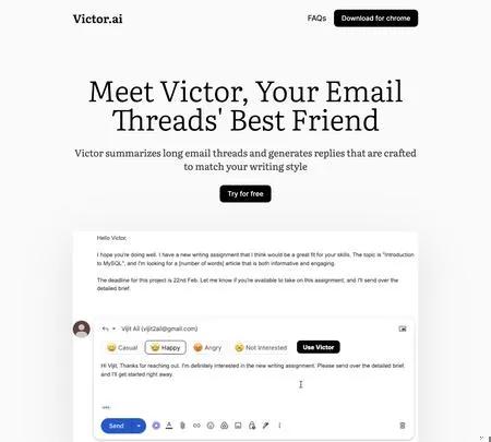 Victor AI is a smart Chrome extension that integrates seamlessly with your Gmail, transforming your email experience. It uses advanced GPT-4 technology to summarize lengthy email threads and craft responses that mirror your unique writing style, boosting your email productivity. With support for multiple email accounts, you can manage all your communications from one place. Victor AI prioritizes your privacy, never storing your data, and operates in real-time for immediate results. Currently, it only supports English and may require extra time for complex tasks due to the intensive AI computations.