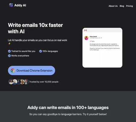 Addy AI é uma ferramenta poderosa que utiliza inteligência artificial para otimizar o processo de escrita de e-mails. Ele é treinado para imitar o seu estilo de escrita em mais de 100 idiomas, criando e-mails personalizados e ricos em contexto em segundos. Seja para redigir um novo e-mail, responder a um recebido ou enviar um acompanhamento, o Addy AI tem tudo o que você precisa. Ele até aprende com seus documentos e links de sites para soar mais como você. Confiado por milhares, o Addy AI está disponível como uma extensão do Chrome com planos gratuitos e pagos, tornando a gestão de e-mails mais fácil e eficiente.